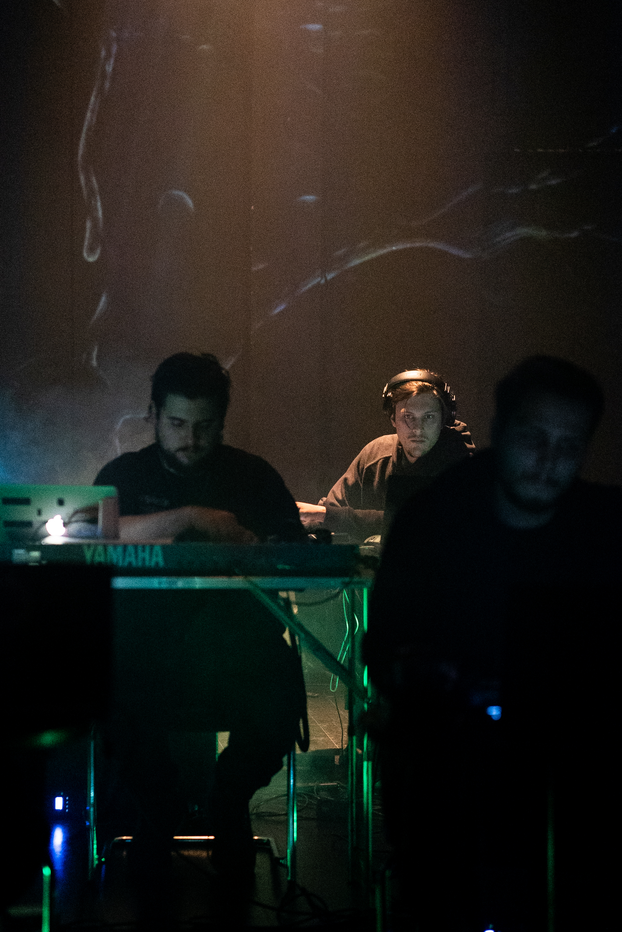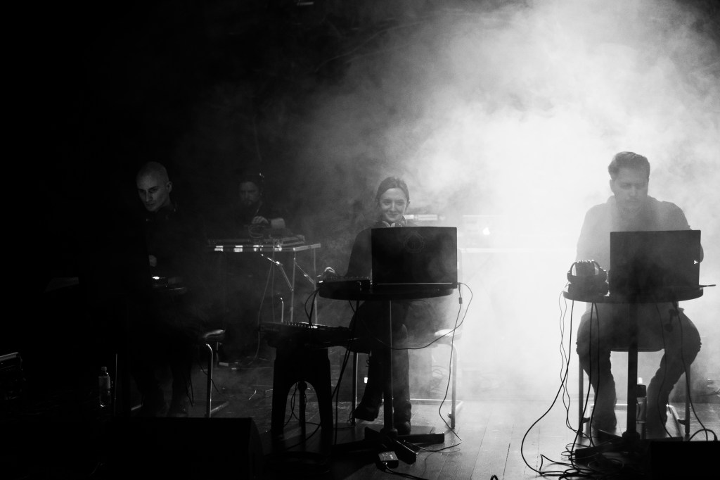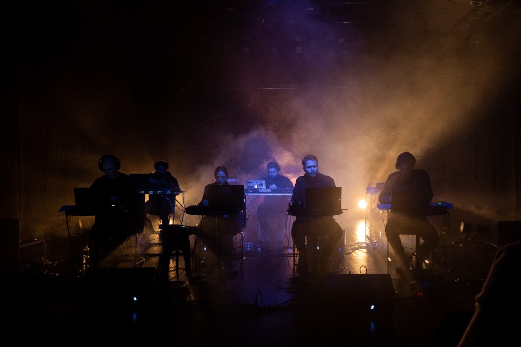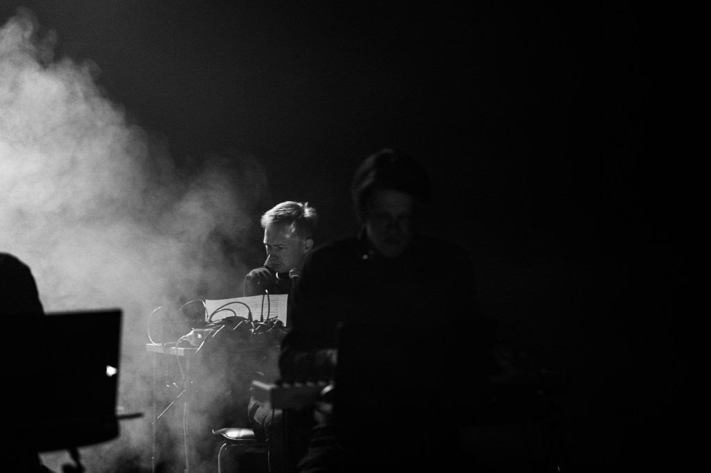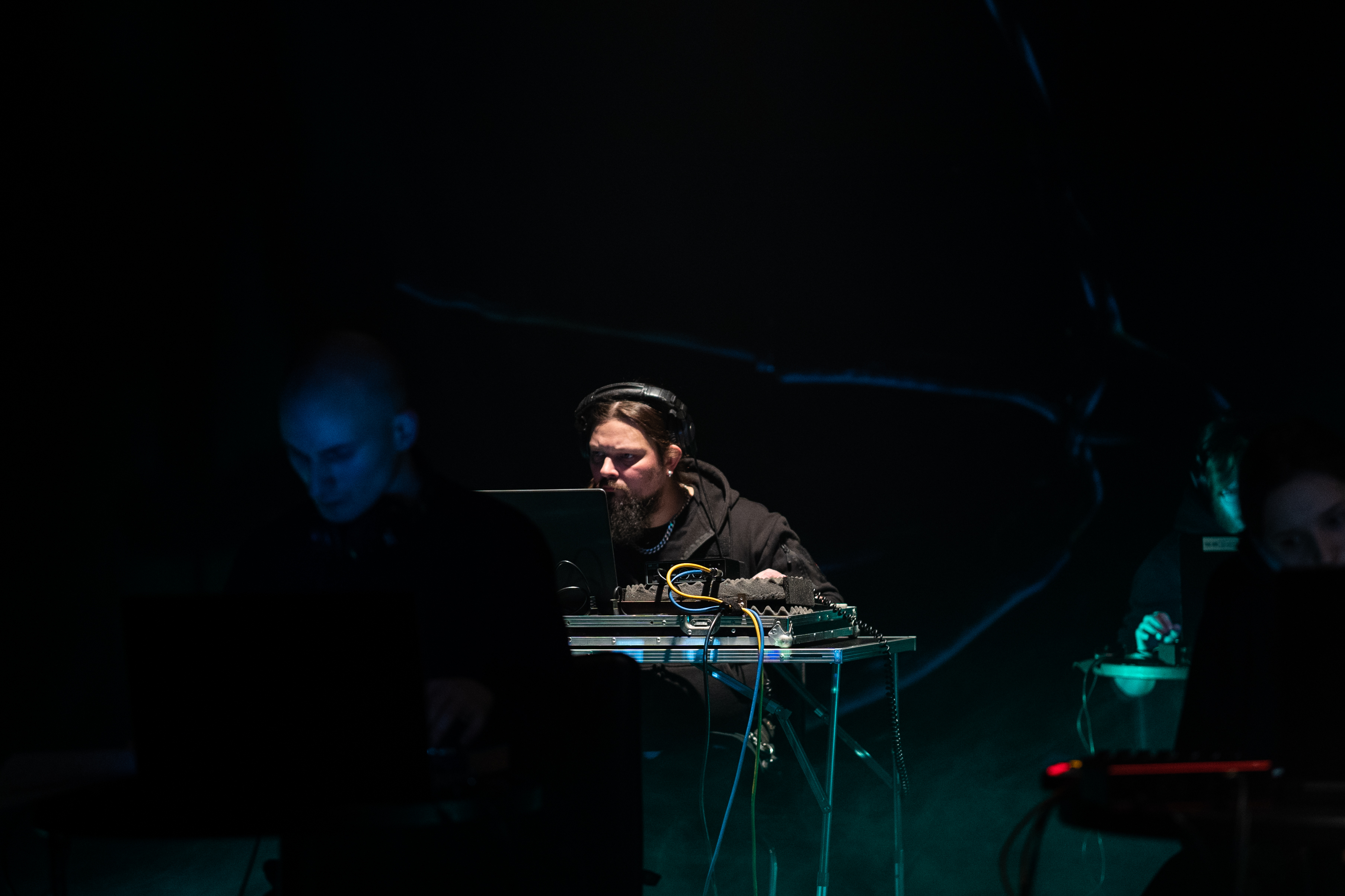 Taigi, vakaro atlikėjai įsitaisė po 4, 3 ir 2 (žiūrint iš salės) scenoje išdėstytuose elektroninių instrumentų fiuzeliažuose, paniro į laptopų monitorius, ir viskas prasidėjo. Aptemo, pasigirdo žemų dažnių triukšmas, dronas. Vienas atlikėjų trūktelėjo iš elektroninės cigaretės, tuomet pasirodė dūmai, bet ne iš jo burnos, o iš užpakalio. Ne jo. Pasirodo, už jo buvo dūmų mašina, kuri garsiai šnypšdama išleido garą. Tuomet ryškiausias prožektorius apšvietė atlikėją scenos centre, o dar kitas, sėdėjęs patamsy, atsistojo, kurį laiką pastoviniavo, tuomet atsisėdo.