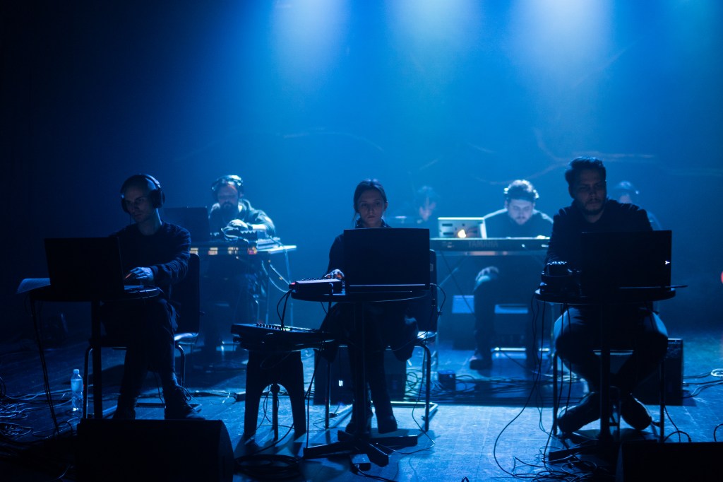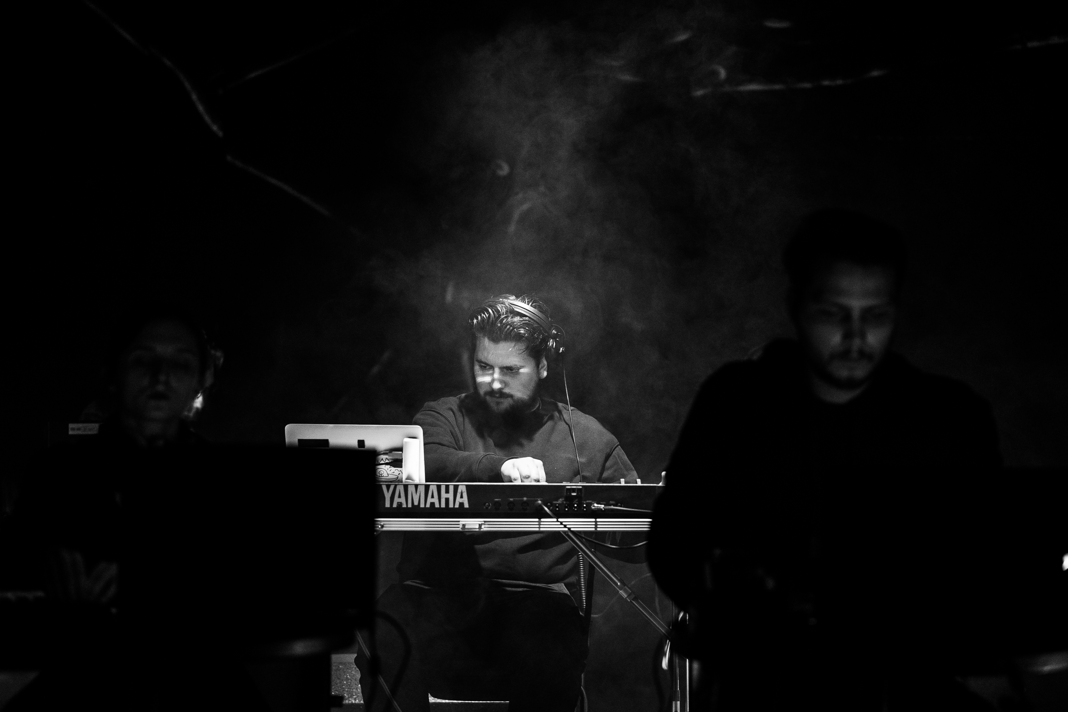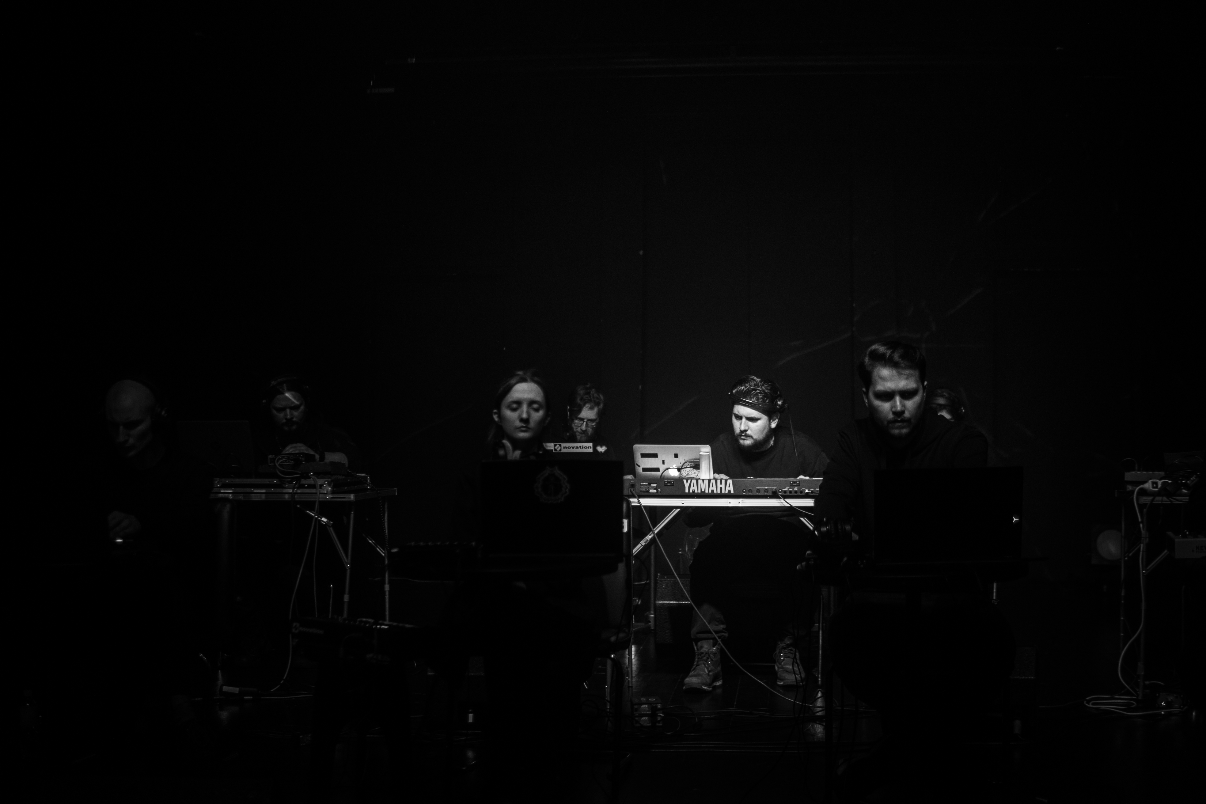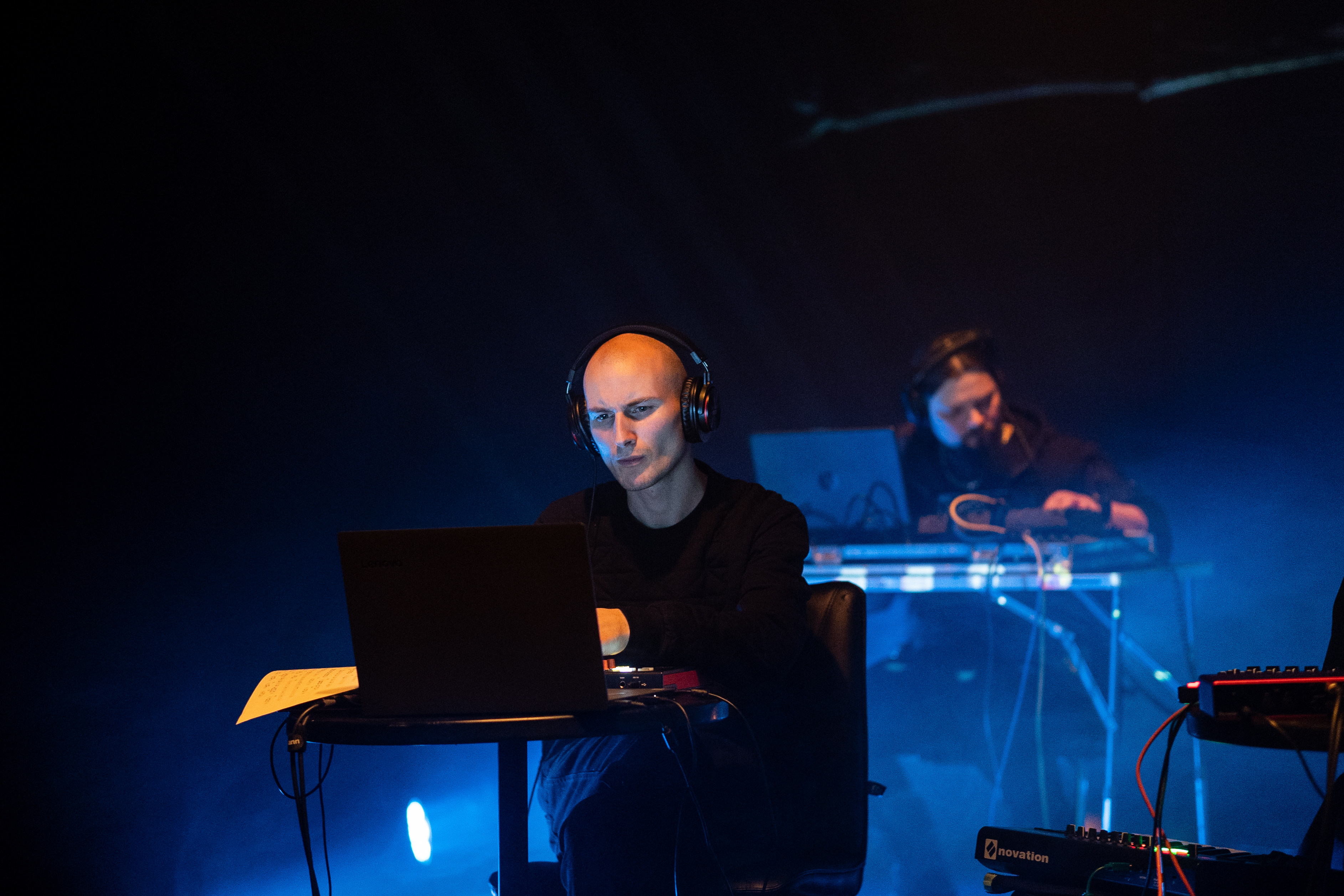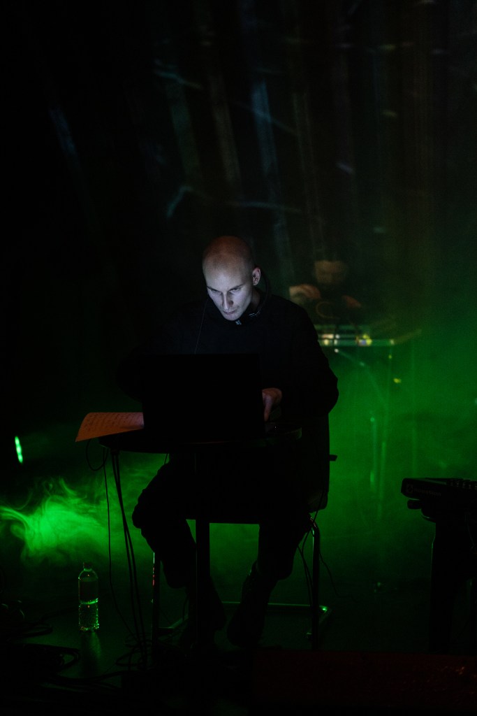 Taigi, vakaro atlikėjai įsitaisė po 4, 3 ir 2 (žiūrint iš salės) scenoje išdėstytuose elektroninių instrumentų fiuzeliažuose, paniro į laptopų monitorius, ir viskas prasidėjo. Aptemo, pasigirdo žemų dažnių triukšmas, dronas. Vienas atlikėjų trūktelėjo iš elektroninės cigaretės, tuomet pasirodė dūmai, bet ne iš jo burnos, o iš užpakalio. Ne jo. Pasirodo, už jo buvo dūmų mašina, kuri garsiai šnypšdama išleido garą. Tuomet ryškiausias prožektorius apšvietė atlikėją scenos centre, o dar kitas, sėdėjęs patamsy, atsistojo, kurį laiką pastoviniavo, tuomet atsisėdo.