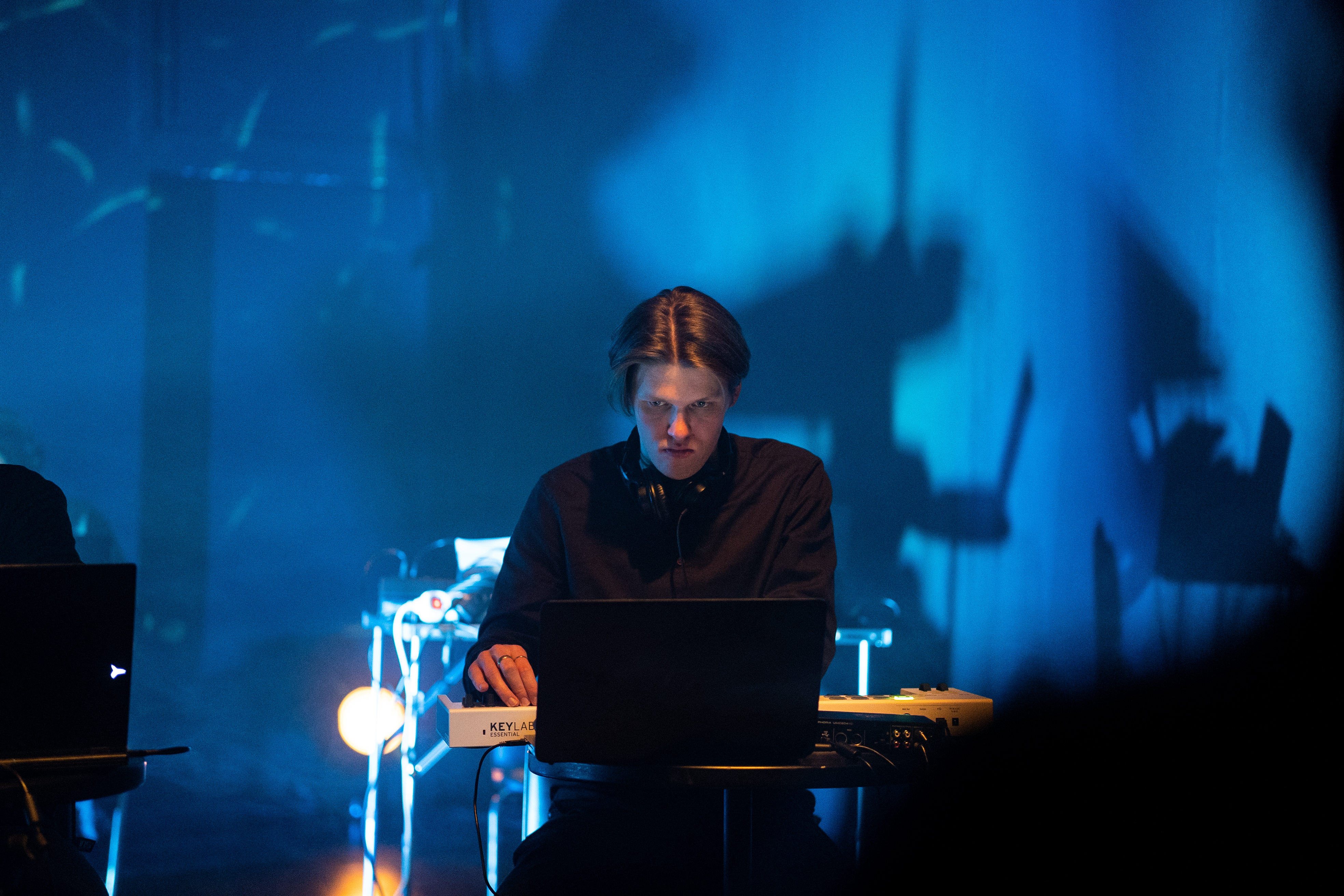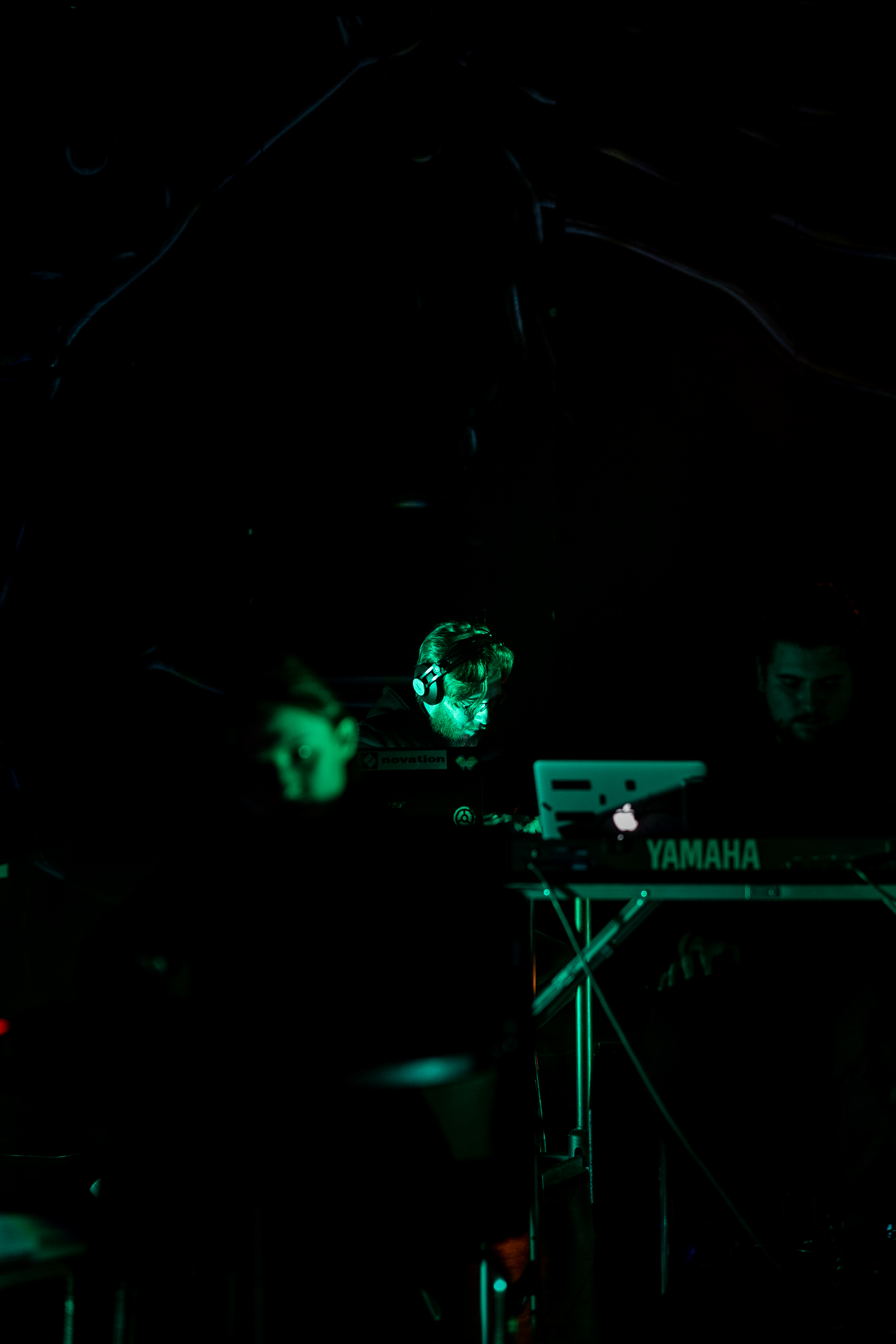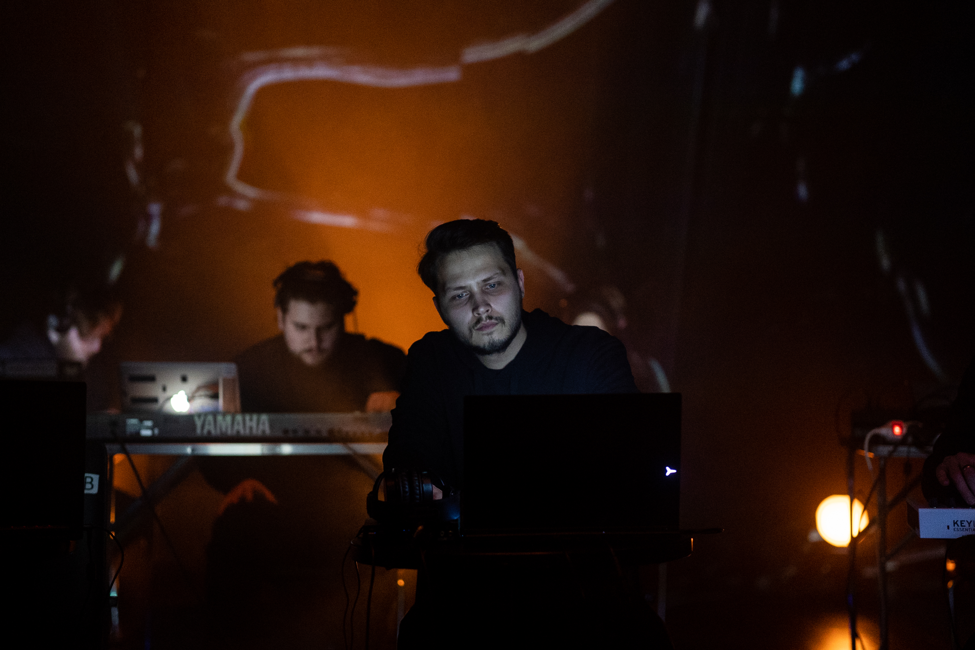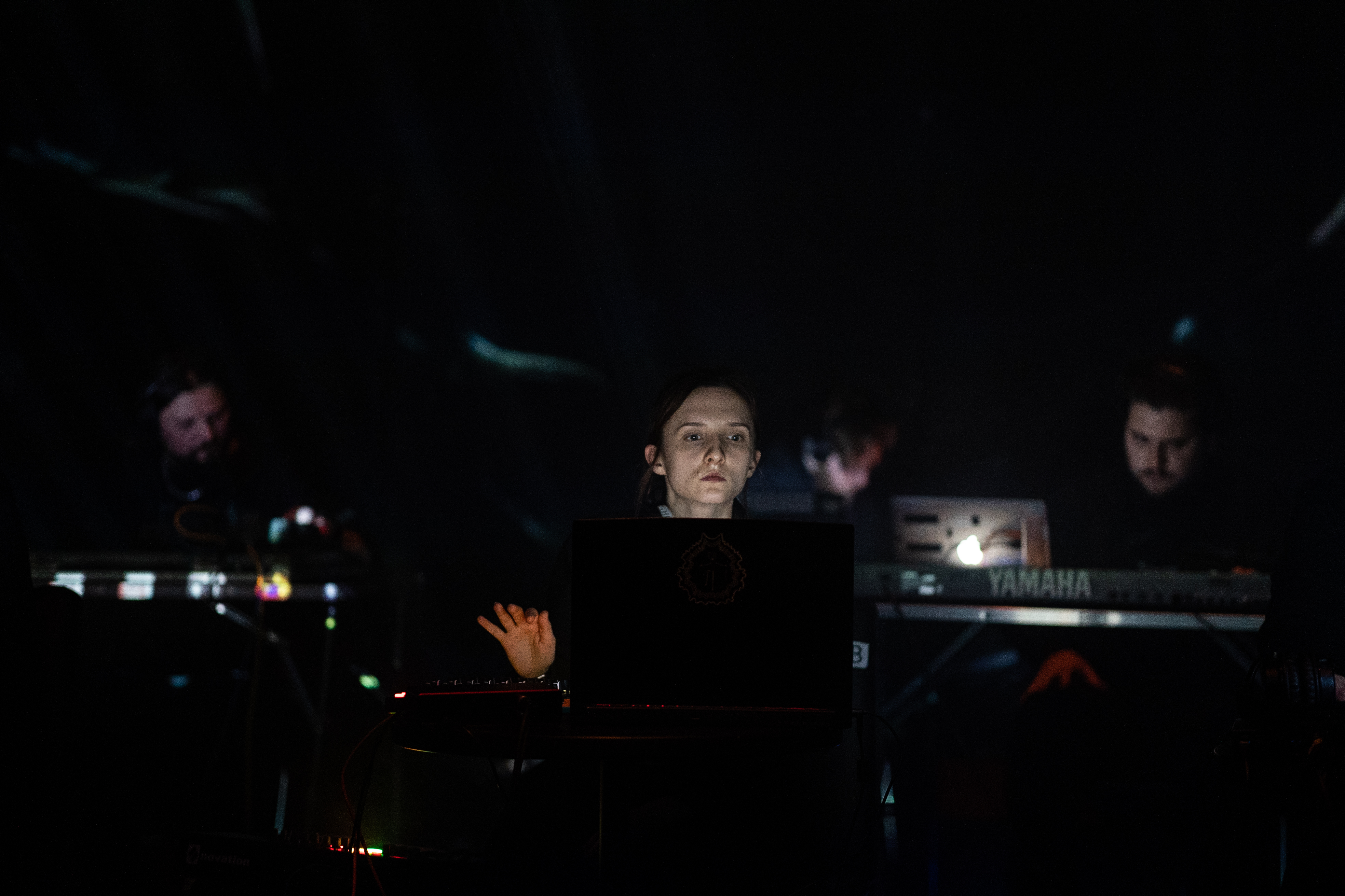 Taigi, vakaro atlikėjai įsitaisė po 4, 3 ir 2 (žiūrint iš salės) scenoje išdėstytuose elektroninių instrumentų fiuzeliažuose, paniro į laptopų monitorius, ir viskas prasidėjo. Aptemo, pasigirdo žemų dažnių triukšmas, dronas. Vienas atlikėjų trūktelėjo iš elektroninės cigaretės, tuomet pasirodė dūmai, bet ne iš jo burnos, o iš užpakalio. Ne jo. Pasirodo, už jo buvo dūmų mašina, kuri garsiai šnypšdama išleido garą. Tuomet ryškiausias prožektorius apšvietė atlikėją scenos centre, o dar kitas, sėdėjęs patamsy, atsistojo, kurį laiką pastoviniavo, tuomet atsisėdo.